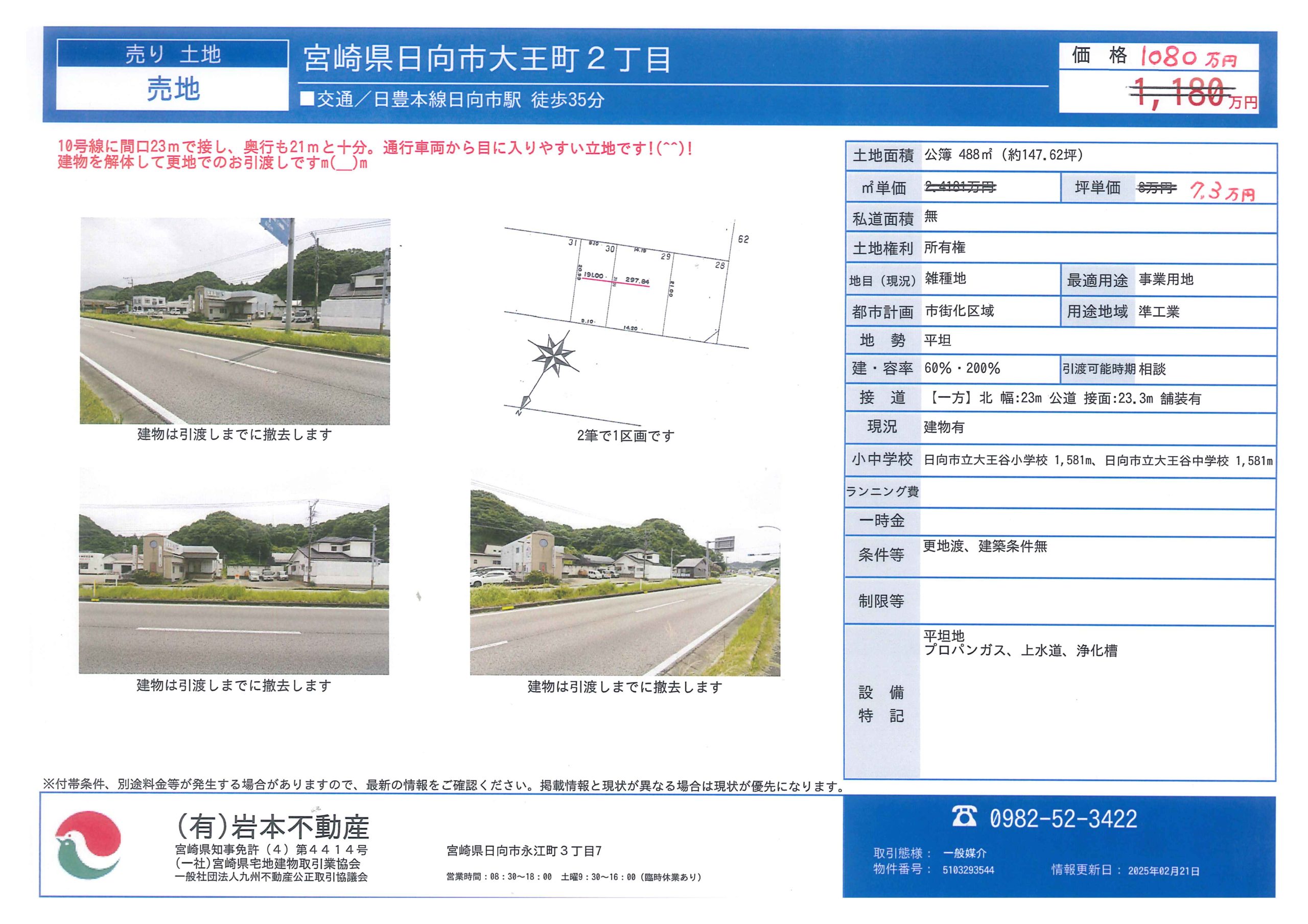 国道10号線に間口23mで面し、奥行も21mと十分。